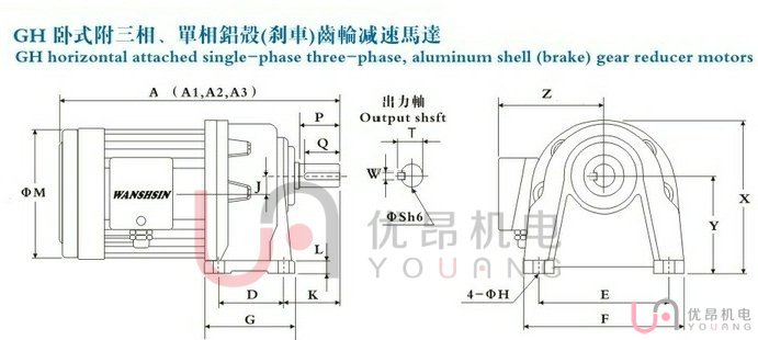 尺寸(mm)A1為三相電機尺寸,A2為單相電機尺寸,A3為帶剎車電機尺寸